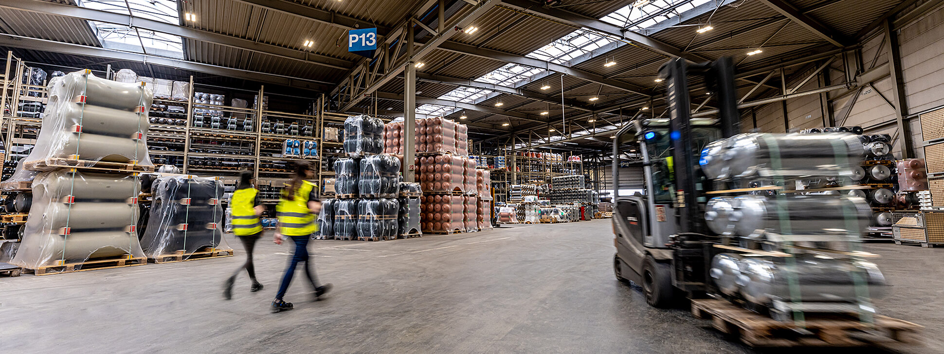 Our warehouse is designed for high availability and efficient material flows: we stock around 4,000 tonnes of raw materials, manage approximately 2,000 pallets of semi-finished parts and 3,000 pallets of finished parts.